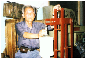 節(jié)能制動(dòng)器創(chuàng)始人張家政先生(左一)在北京起重運(yùn)輸機(jī)械研究所實(shí)驗(yàn)臺(tái)上進(jìn)行檢測(cè)